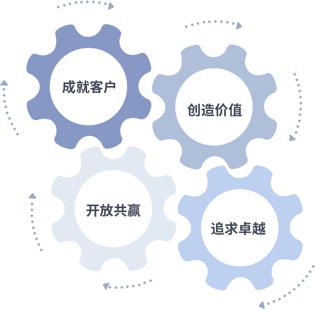 成就客户是一切决策的出发点,,,,创造价值是衡量所有工作的标准,,,,追求卓越是我们做事做人的态度,,开放共赢是我们的格局也是最终的结果。。。价值观的齿轮环环相扣,,,推动着组织里的每个人不断向前。。。。